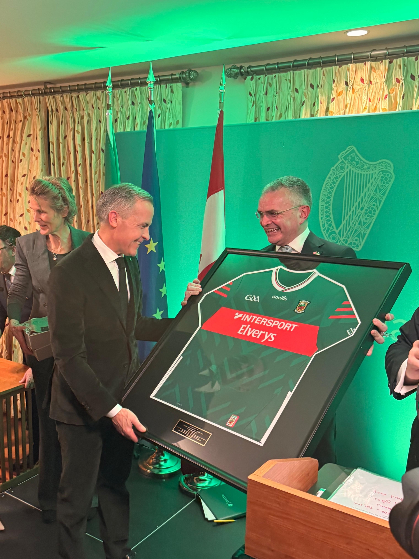Canadian Prime Minister Mark Carney was presented with the Mayo GAA jersey by Minister for Rural and Community Development and the Gaeltacht Dara Calleary