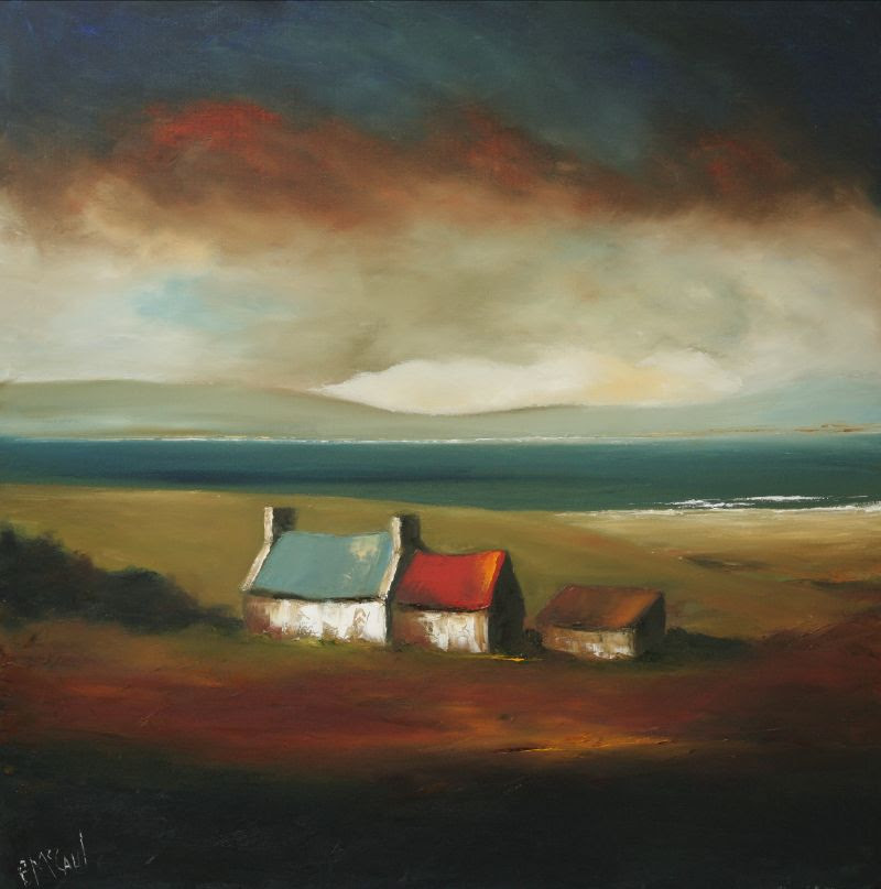 “The ever changing skies and moods are the starting point of most of my work and wrap themselves around the ubiquitous cottages and farm buildings that I have been painting for many years now. Their purpose is to draw you into the landscape, the colours and textures aim to create the emotional connection. The Atlantic Ocean features prominently in these paintings, being ever present when you are living on an island,” Padraig said about the exhibition.