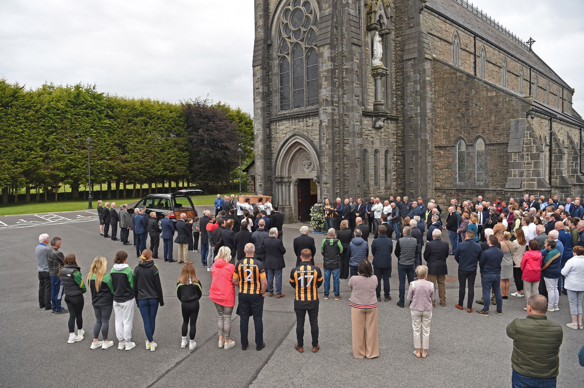 Crowds gathered outside the Cathedral of the Annunciation of the Blessed Virgin Mary and St Nathy, Ballaghaderreen, at the removal of the late John O'Mahony (Pic: Conor McKeown)