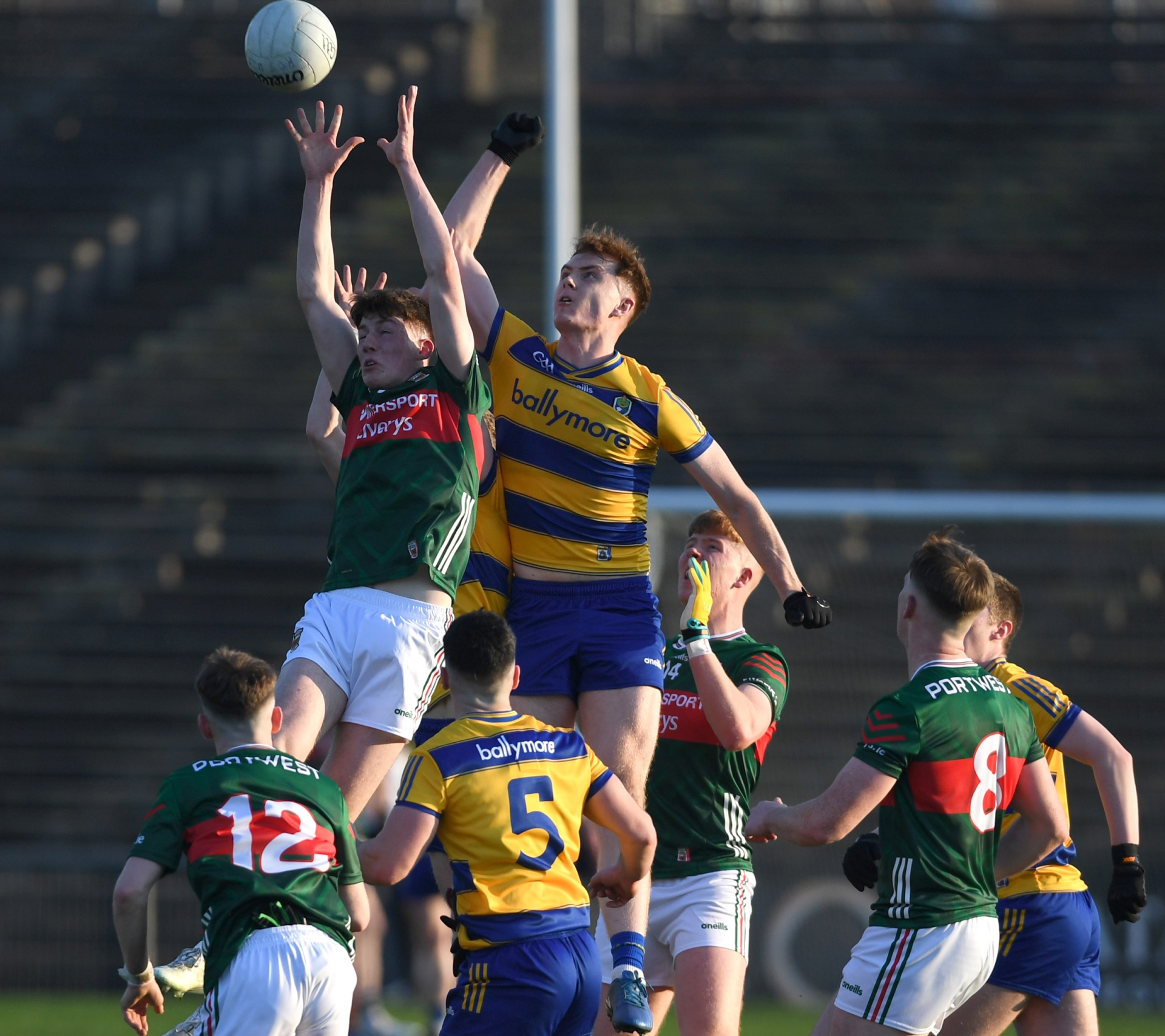 The Mayo and Roscommon U-20s battle for possession in Round 1 of the 2025 Connacht U-20 Football Championship in Hastings Insurance MacHale Park