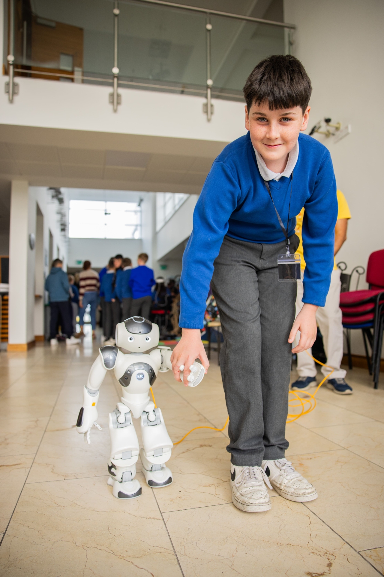 Mylo Carey, Belmullet NS with a NAO Robot at the Foróige and Microsoft Dream Space Showcase in Áras Inis Gluaire, Belmullet