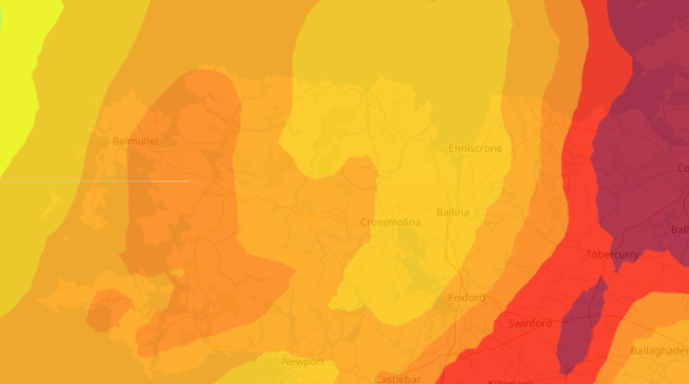 The map shows that the east of the county appears to have taken the brunt of the rain, with the N17 from Charlestown to Kilkelly in the darkest shade of red.