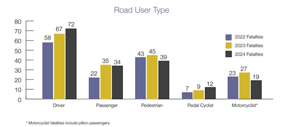Motorcyclist fatalities decreased to their lowest level since 2020, with 19 deaths recorded in 2024 compared to 27 in 2023.